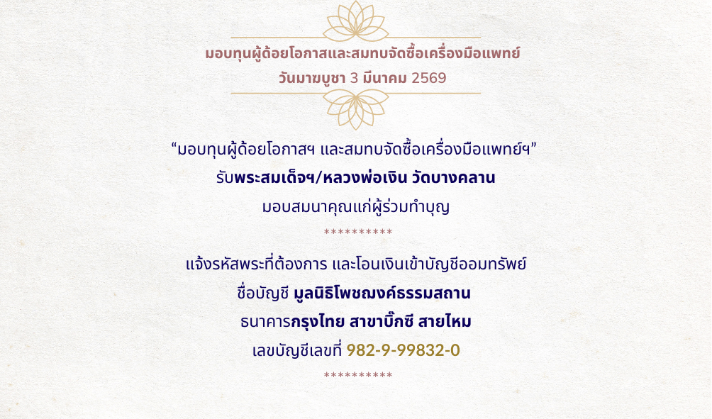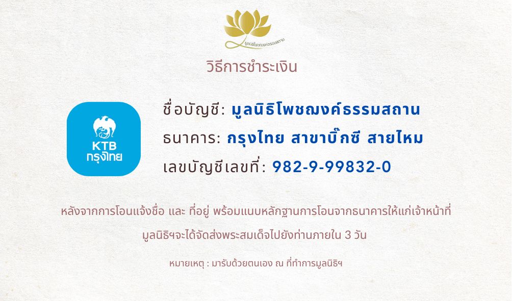 ชื่อบัญชี มูลนิธิโพชฌงค์ธรรมสถาน ธนาคารกรุงไทย สาขาบิ๊กซี สายไหม